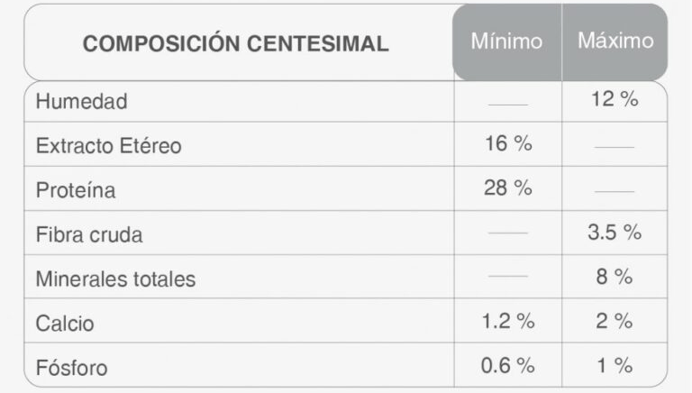 Harina de pollo, arroz, gluten de maíz, germen de maíz desgrasado, grasa animal (pollo-cerdo), aceite de pescado (fuente de omega 3 y 6), hidrolizado proteico bovino, pulpa de remolacha (fuente de fructo-oligosacáridos – FOS), levadura de cerveza, zeolita, sal, extracto de yucca schidigera, manano-oligosacáridos – MOS, nucleótidos de levadura, carbonato de calcio, dipropionato de amonio, ácido propiónico, acetato de zinc, pirofosfato ácido de sodio, glucosamina, condroitin sulfato, ascorbato de manganeso, metionina, ácido cítrico, tocoferoles, antioxidantes naturales: extracto de romero, vitamina C, betacaroteno, licopeno, luteína, polifenoles, taurina, vitaminas: A, D3, E, K, B1, B2, B6, B12, ácido fólico, ácido nicotínico, pantotenato de calcio, biotina, colina, minerales: zinc, hierro, cobre, yodo, selenio.